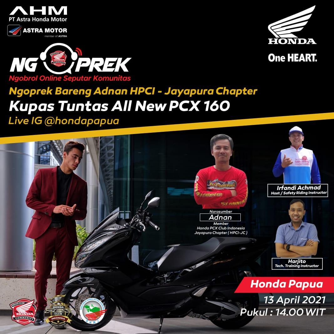 Astra Motor Papua kembali mengadakan live instagram bersama community Honda perwakian dari HPCI Chapter Jayapura Bro Adnan selaku Humas di Honda PCX Club Indonesia Jayapura Chapter, dalam live Instagram Honda Papua kali ini kami mengupas tuntas technologi dan fitur baru yang ada di Honda PCX 160cc, di bantu langsung oleh Bro Harjito selaku technical service instructur Honda Papua menjalaskan secara detail fitur dan model baru dari Honda PCX160cc yang baru ini.