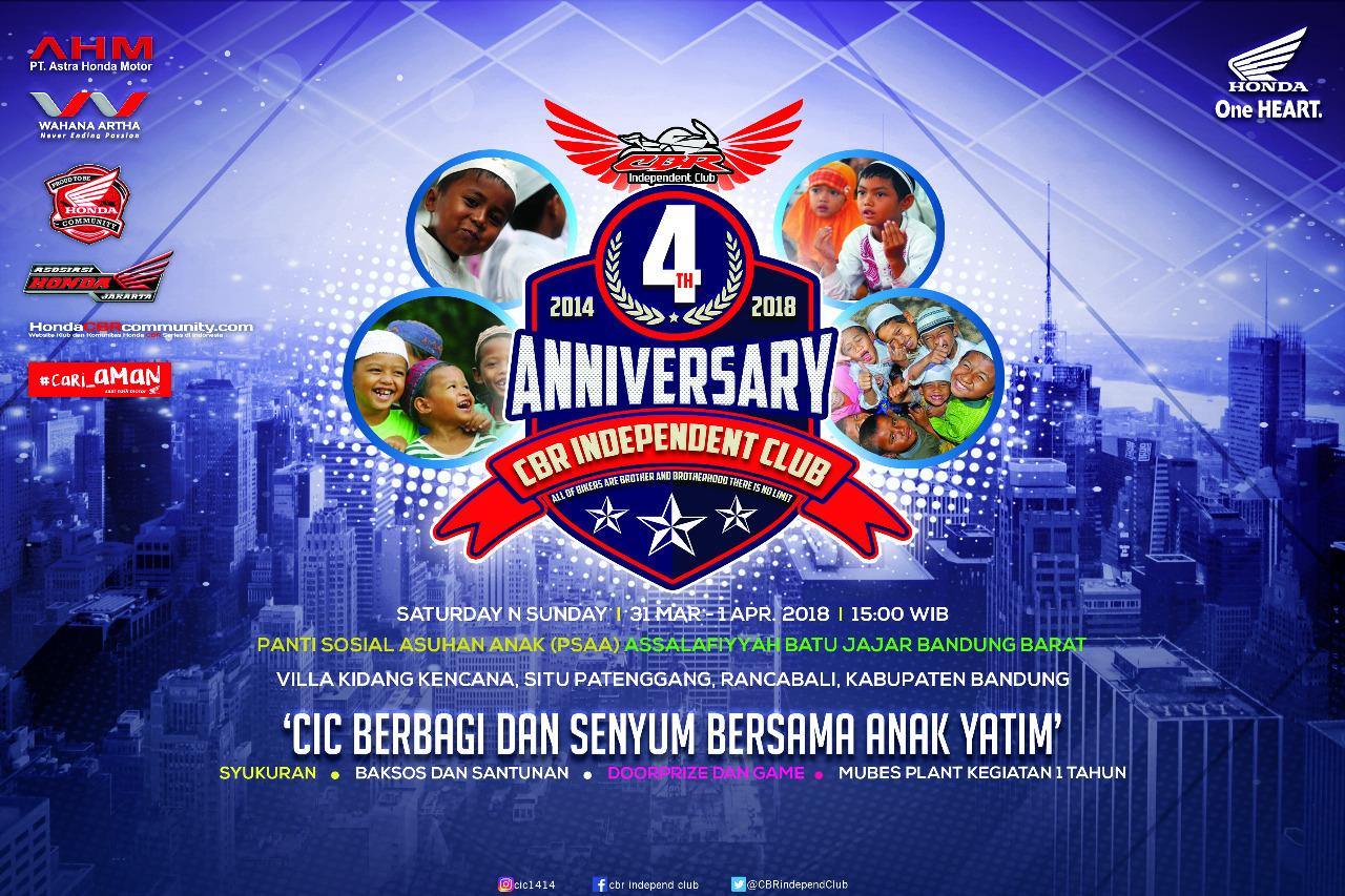 CBR Independent Club (CIC) akan merayakan hari ulang tahunnya dengan mengangkat tema “CIC Berbagi dan Senyum Bersama Anak Yatim Piatu” pada tanggal 31 Maret 2018.