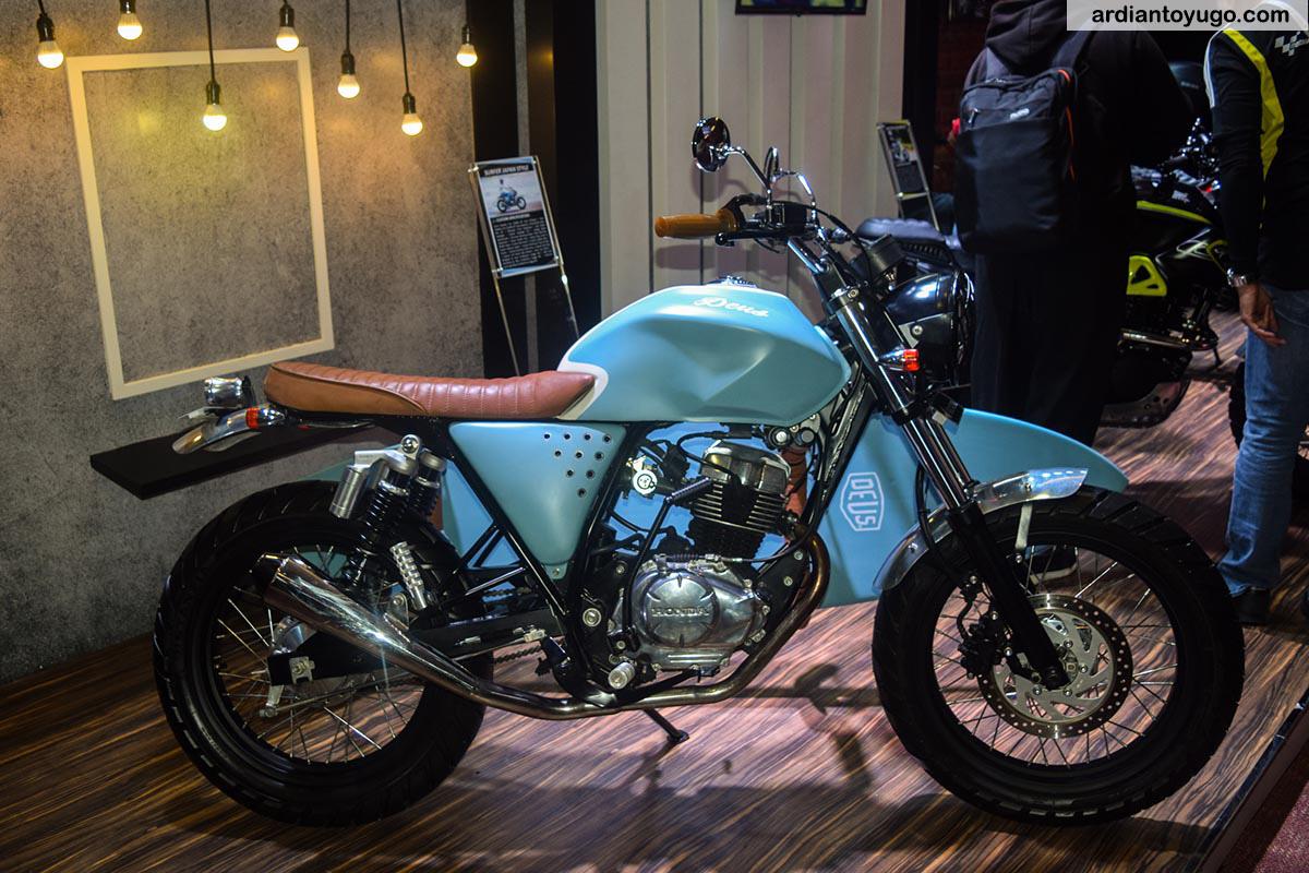 Unit yang satu ini dihadirkan dengan konsep modifikasi Japan Style. Konsep Japan Style sendiri sudahsangat populer di kalangan pecinta motor retro di Indonesia. Secara ergonomi pun konsep ini sangat nyaman digunakan untuk berkendara sehari-hari. Pada unit modifikasi yang dipercayakan pada builder terkenal Deus Ex-Machina Canggu - Bali, Penggunaan warna biru muda dan putih mampu menambah kesan “fun beach bike”. Selain itu, unit ini juga dilengkapi dengan papan surfing dan bracket samping untuk mendukung style dan hobby anak muda. Mau tahu part-part modifikasi apa saja yang digunakan? Ini dia Kita simak bareng, Lur.