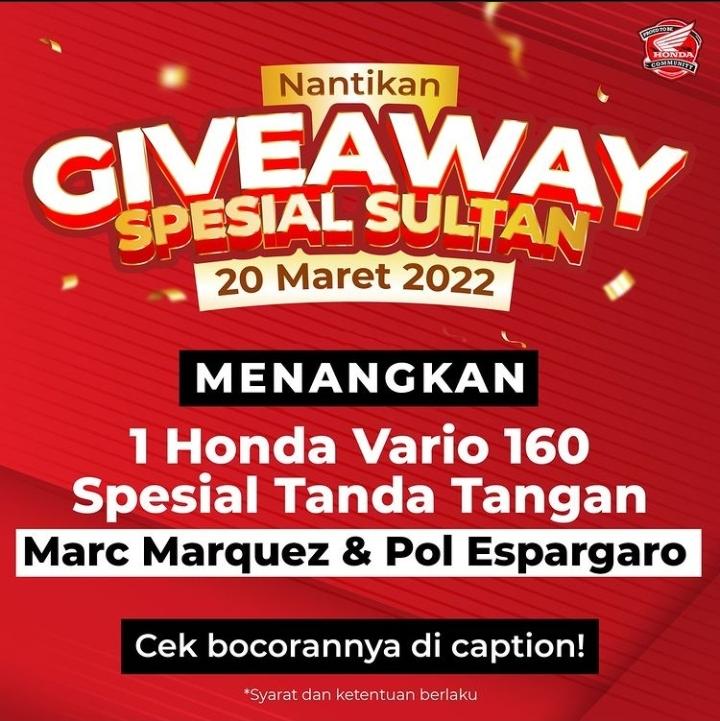 Honda akan mengadakan Giveaway pada tanggal 20 Maret 2022. Ssssttt hadiahnya bukan kaleng-kaleng jo, 1 Motor Honda Vario 160.