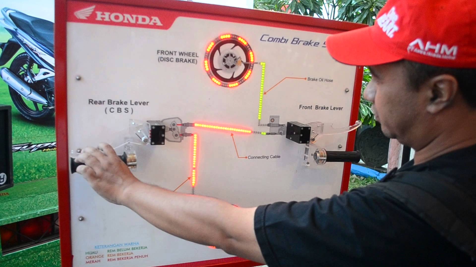 Jika dilihat secara detail, pada tuas rem kiri atau rem belakang terdapat equalizer bercabang dua. Dimana satu kabel mengarah langsung ke rem balakang dan satu kabel lainnya ke kabel konektor tadi. Kabel konektor akan menarik knocker dan mendorong piston hidrolik yang ada di master rem depan.