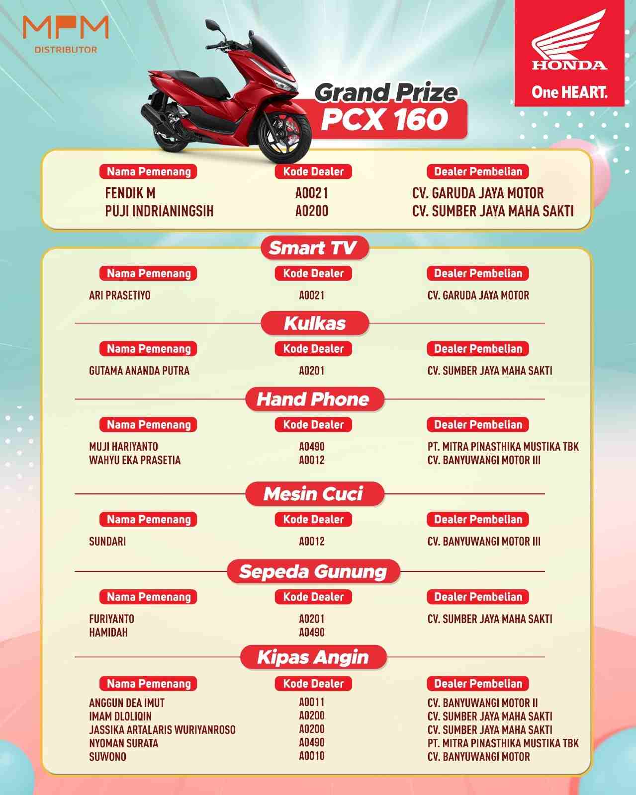 Pengumuman pemenang undian untuk wilayah Banyuwangi telah dilakukan secara live melalui akun Instagram resmi @mpmhondajatim, sehingga seluruh konsumen dapat menyaksikan proses pengundian secara langsung, transparan, dan meriah.
