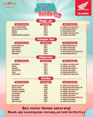 Apresiasi kepada konsumen setia PT Mitra Pinasthika Mulia (MPM Honda Jatim) selaku distributor sepeda motor Honda untuk wilayah Jawa Timur dan Nusa Tenggara Timur bersama jaringan dealer Honda Banyuwangi berikan. Melalui program undian spektakuler bertajuk Untukmu Konsumen Honda apresiasi diberikan.
