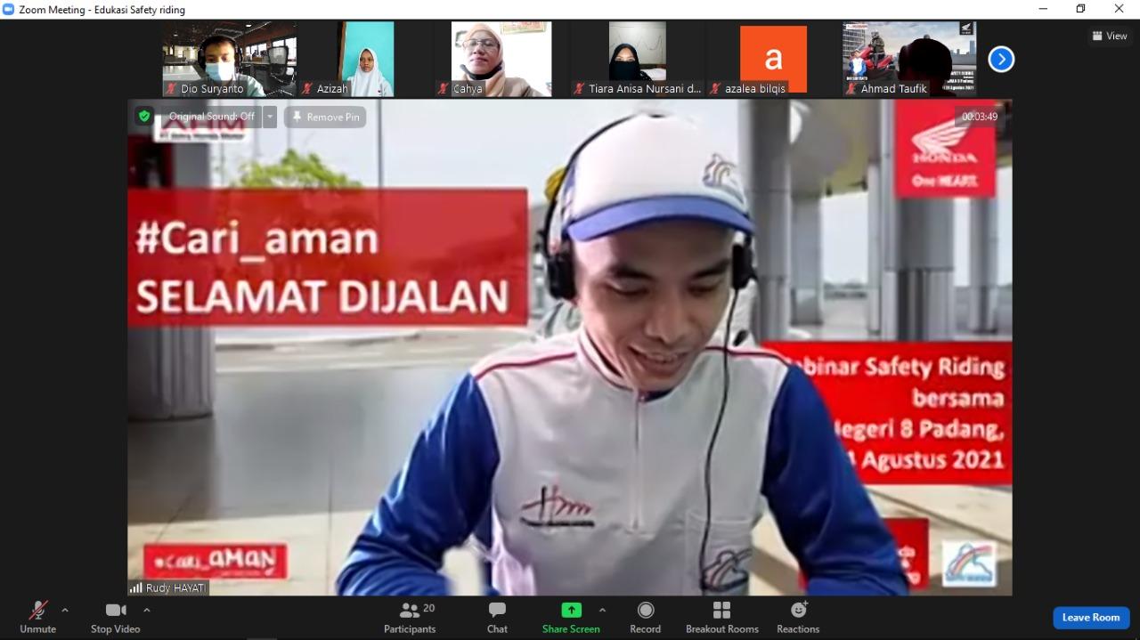 Kegiatan Edukasi secara daring melalui Aplikasi Zoom ini dipandu oleh Dio Suryanto selaku Safety Riding Instructor PT.Hayati Pratama Mandiri diikuti oleh lebih kurang 70 peserta dari SMA N 8 Padang. Webinar ini bertujuan untuk menimbulkan dan memupuk kepedulian akan keselamatan berkendara di kalangan pelajar dan para pengguna sepeda motor. Karena survey di lapangan membuktikan, kalangan pelajar dan usia produktif sangat rentan terlibat dalam kecelakaan lalu lintas yang disebabkan dari rendahnya kesadaran akan pentingnya #cari_aMaN saat berkendara, serta faktor kondisi kendaraan yang minim perawatan serta kondisi prasarana jalan yang buruk. Di awal sesi pada edukasi ini, para peserta diberikan pre test terkait safety riding serta ditutup degan post test di akhir seminar.