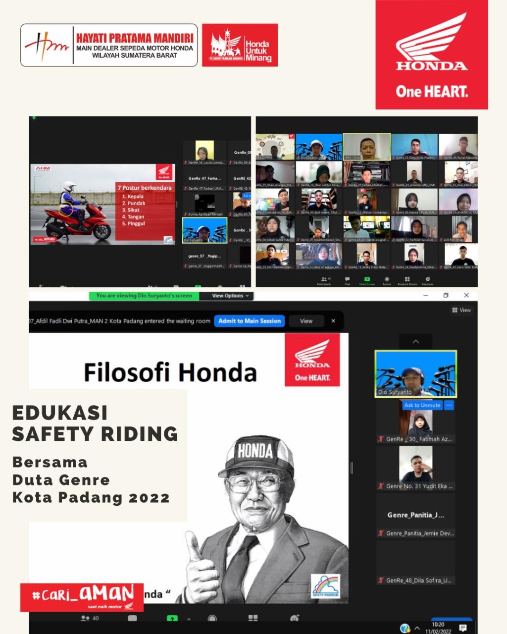 PT.Hayati Pratama Mandiri terus memperkuat komitmennya di bidang safety riding dengan menggandeng sebanyak mungkin generasi muda sadar akan pentingya keselamatan berkendara di jalan raya. Pada kesempatan kali ini Honda Hayati bersama dengan tim Safety Riding menggelar sosialisasi keselamatan berkendara kepada para Duta GenRe Kota Padang 2022, 11 Februari 2022