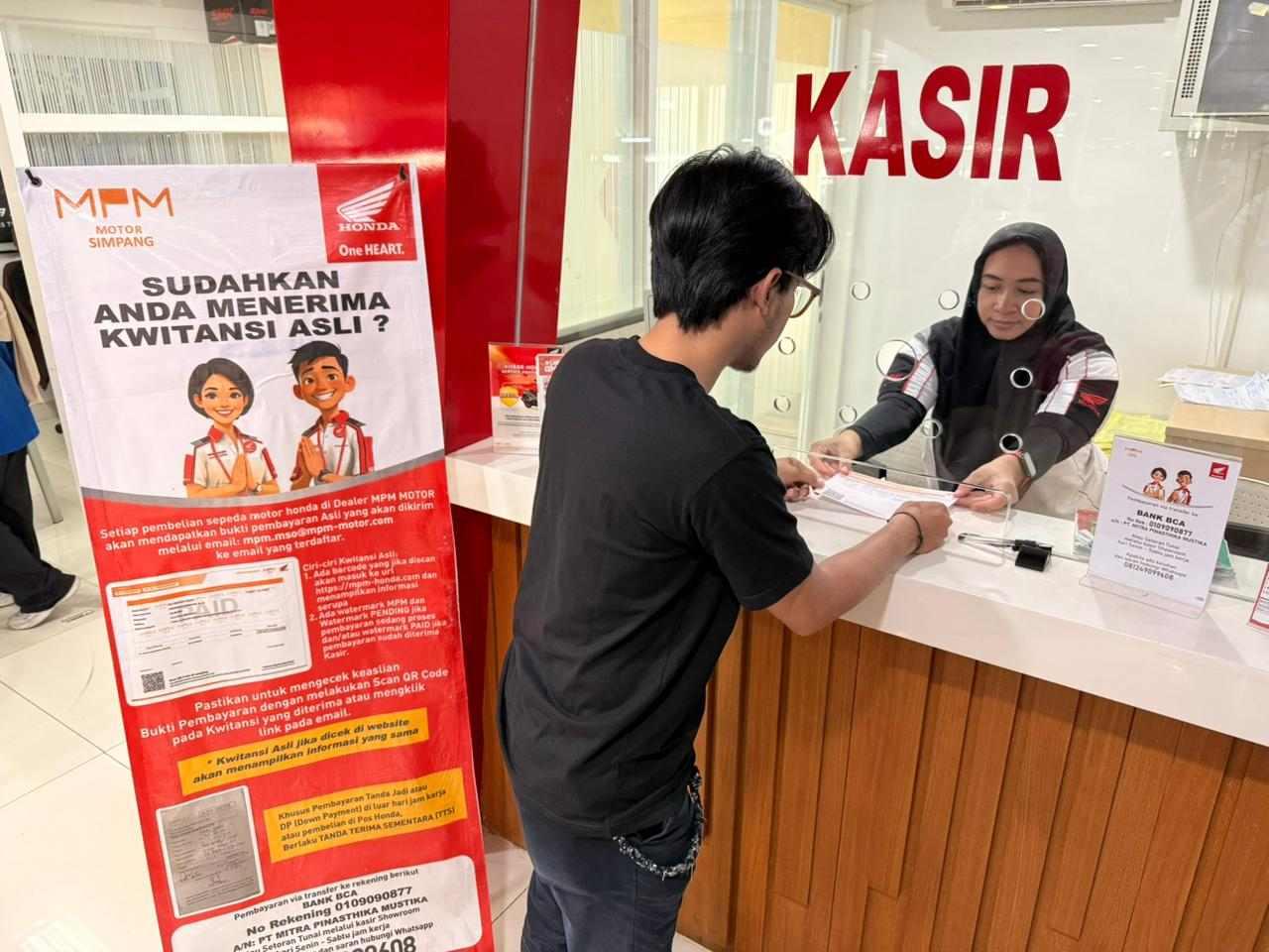 Setiap transaksi pembelian akan disertai kwitansi resmi, baik dalam bentuk cetak maupun digital. Untuk pembelian motor dengan status inden, konsumen wajib menerima kwitansi sah sebagai tanda jadi. Contoh kwitansi resmi dapat dilihat di area kasir, meja sales counter (dalam bentuk acrylic atau banner), serta di platform digital resmi Honda.